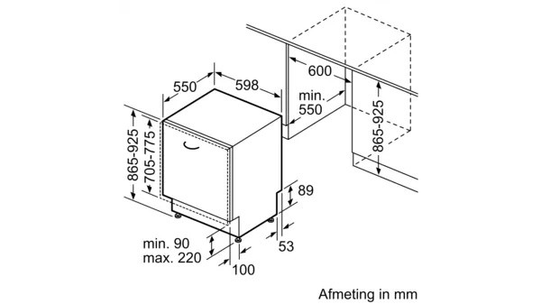 - Afmetingen van het apparaat h(min/max)xbxd 865 x 598 x 550 mm