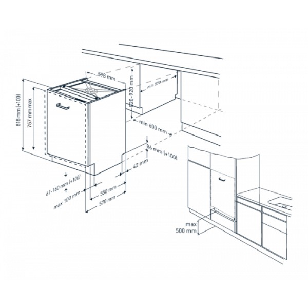 | Hoogte vaatwas + hieronder hoogte plint/sokkel aanduiden | 81,5cm tot 86,5cm (Standaard) (greeploze keuken: onderkant greeplijst tot vloer meten) |