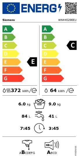 9KG wassen / 6KG drogen - 1400 t/min - Reloadfunctie (was toevoegen tijdens wasbeurt) - Kort Programma Wash&Dry 60min. - Was-droogcombinatie / Siemens WN 44G200 EU
