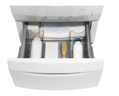 Het voetstuk vormt een platform voor je machines en de lades hebben vakken om je te helpen bij het opbergen van wasmiddelen en accessoires. Het resultaat is een beter georganiseerde waservaring.